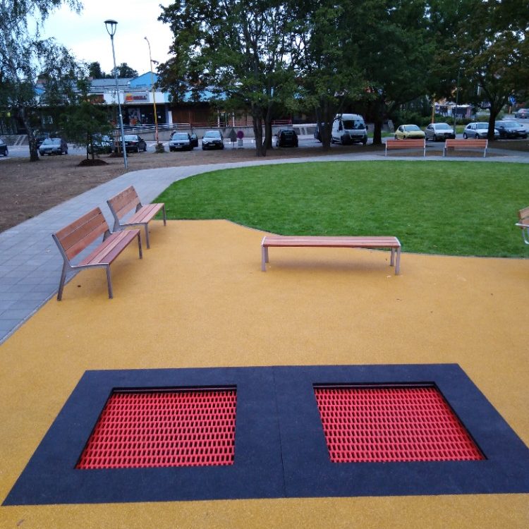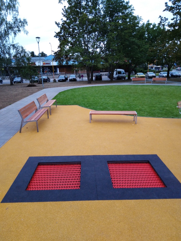 V parku K Jezírku umístit dvě zemní trampolínky o rozměrech skákací plochy 100 × 100 cm.