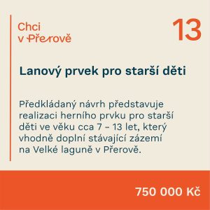 Předkládaný návrh představuje realizaci herního prvku pro starší děti ve věku cca 7 – 13 let, který vhodně doplní stávající zázemí na velké Laguně. Lanové hřiště nabídne bezpečné, certifikované a atraktivní herní prvky: vysoké lanové sítě, mosty, prolézačky a skluzavky, které děti doslova vtáhnou do dobrodružství. Přerov dnes postrádá hřiště, která by vyhovovala dětem od 7 let výše.