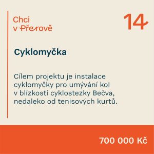 Cílem projektu je umístění a instalace cyklomyčky pro umývání kol. Cyklomyčka může být nainstalována v blízkosti cyklostezky nebo tam, kde je velká koncentrace cyklistů a umožní jim použít myčku pro umytí kol. Myčka nepotřebuje připojení k elektrice, pouze napojení na vodu.
