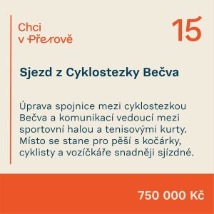 Záměr počítá s úpravou spojnice mezi Cyklostezkou Bečva a komunikací vedoucí mezi sportovní halou a tenisovými kurty. Tento sjezd je momentálně vysypán kamenivem a je pro cyklisty, koloběžkáře a jiné obtížně překonatelný. Vozíčkáři tudy neprojedou vůbec. Po úpravě se místo stane pro pěší s kočárky, cyklisty a vozíčkáře snadněji sjízdné, bezpečnější.