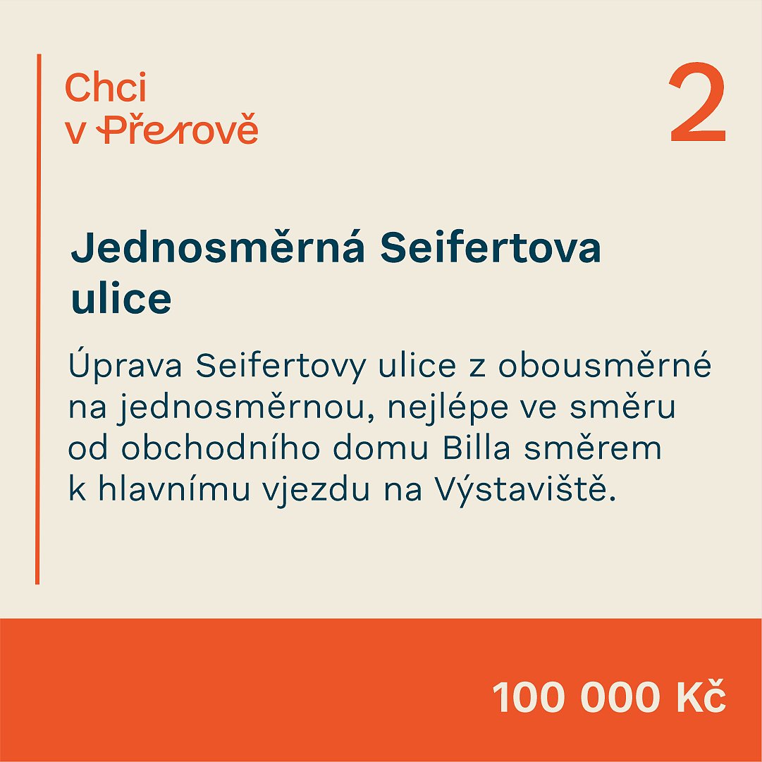 Projekt spočívá v úpravě Seifertovy ulice z obousměrné na jednosměrnou, nejlépe ve směru od obchodního domu Billa směrem k hlavnímu vjezdu na Výstaviště, v úseku od křižovatky Seifertova – Mikuláškova do křižovatky Seifertova – U Výstaviště. Zvýší se parkovací kapacita a bezpečnost v lokalitě.