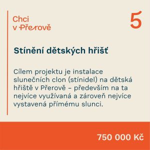 V Přerově je řada dětských hřišť, která jsou během letních měsíců plně vystavena přímému slunci. Herní prvky, jako jsou skluzavky nebo pískoviště, se rozpálí na tak vysokou teplotu, že je nelze bezpečně využívat. Cílem projektu je zlepšit komfort a bezpečnost dětí na hřištích tím, že klíčové herní plochy budou zastíněny slunečními clonami.