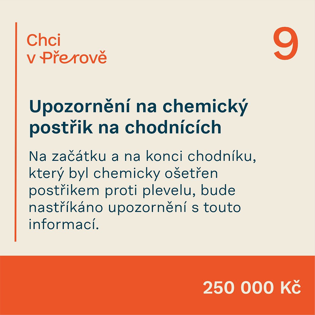 Vzhledem k tomu, že je v teplých měsících řešeno zaplevelení chodníků postřikem chemickou látkou (Roundup), což nedělá dobře (nejen) zvířatům, je v rámci projektu navrženo na chodníky souběžně s aplikací chemické látky nastříkat upozornění na chemické ošetření daného úseku – vždy na začátku a konci ošetřeného chodníku.