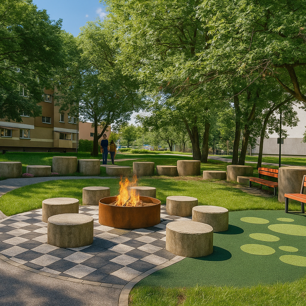 Povrch priestoru sčasti spevniť štrkom alebo obdobným materiálom. Existujúce betónové skruže vyčistiť a prispôsobiť na sedenie, doplniť obrubníky, hracie prvky. Premiestniť a vyčistiť lavičky a doplniť smetné koše. Možnosť doplniť ohnisko a stojany na bicykle. Obrázok je ilustračný.