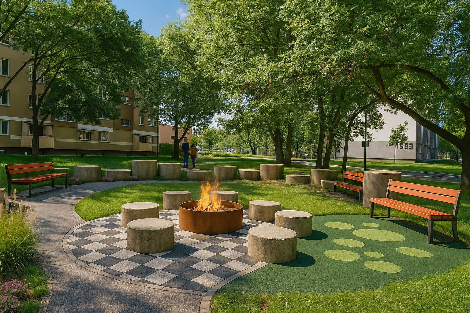 Povrch priestoru sčasti spevniť štrkom alebo obdobným materiálom. Existujúce betónové skruže vyčistiť a prispôsobiť na sedenie, doplniť obrubníky, hracie prvky. Premiestniť a vyčistiť lavičky a doplniť smetné koše. Možnosť doplniť ohnisko a stojany na bicykle. Obrázok je ilustračný.