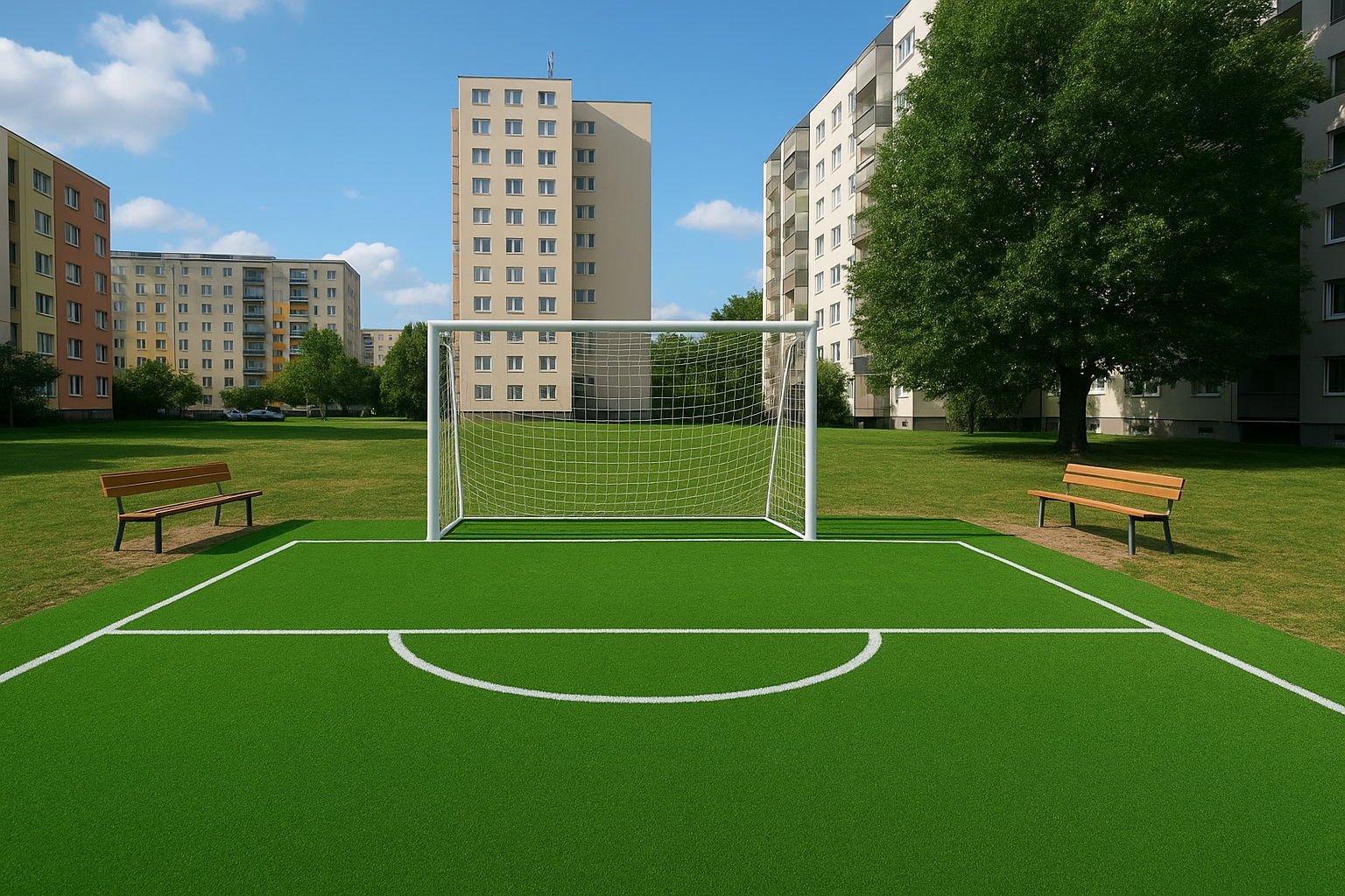 Povrch ihriska bude upravený, osadia sa nové bránky a exteriérová sieť (kvôli ochrane áut na priľahlom parkovisku), osadia sa lavičky. Obrázok je ilustračný.