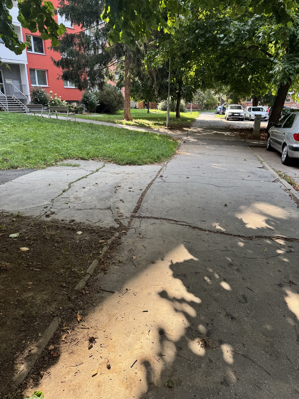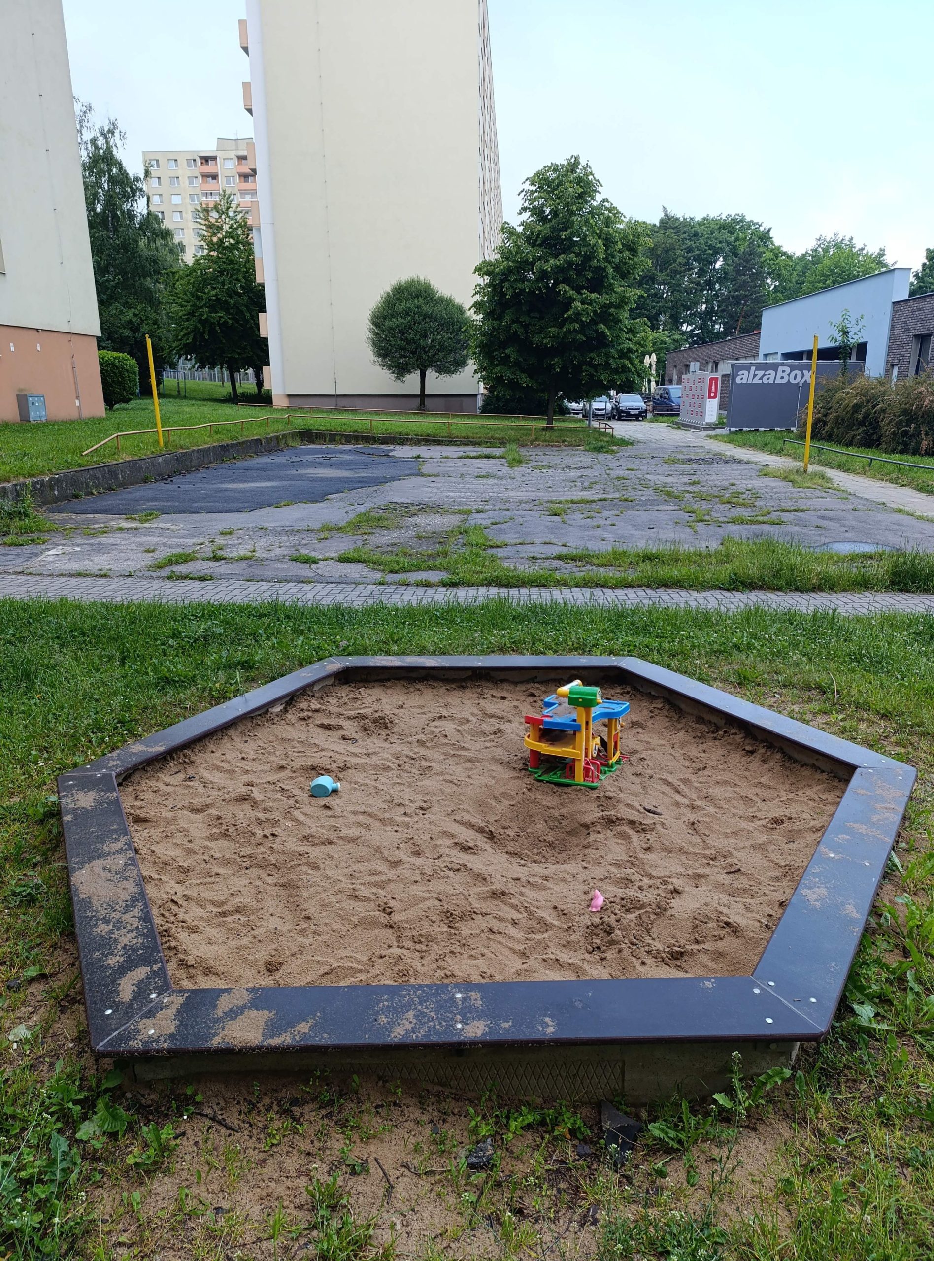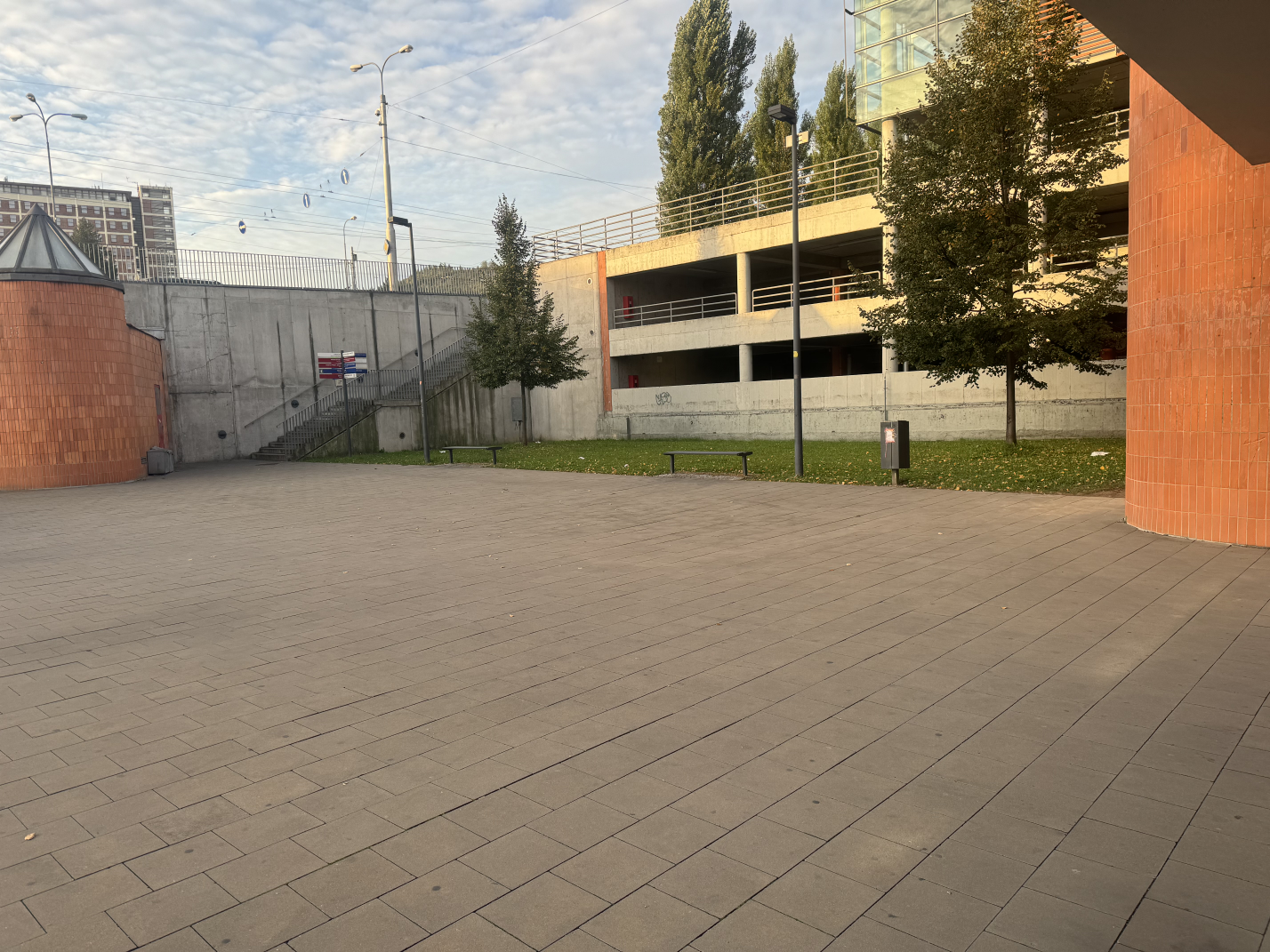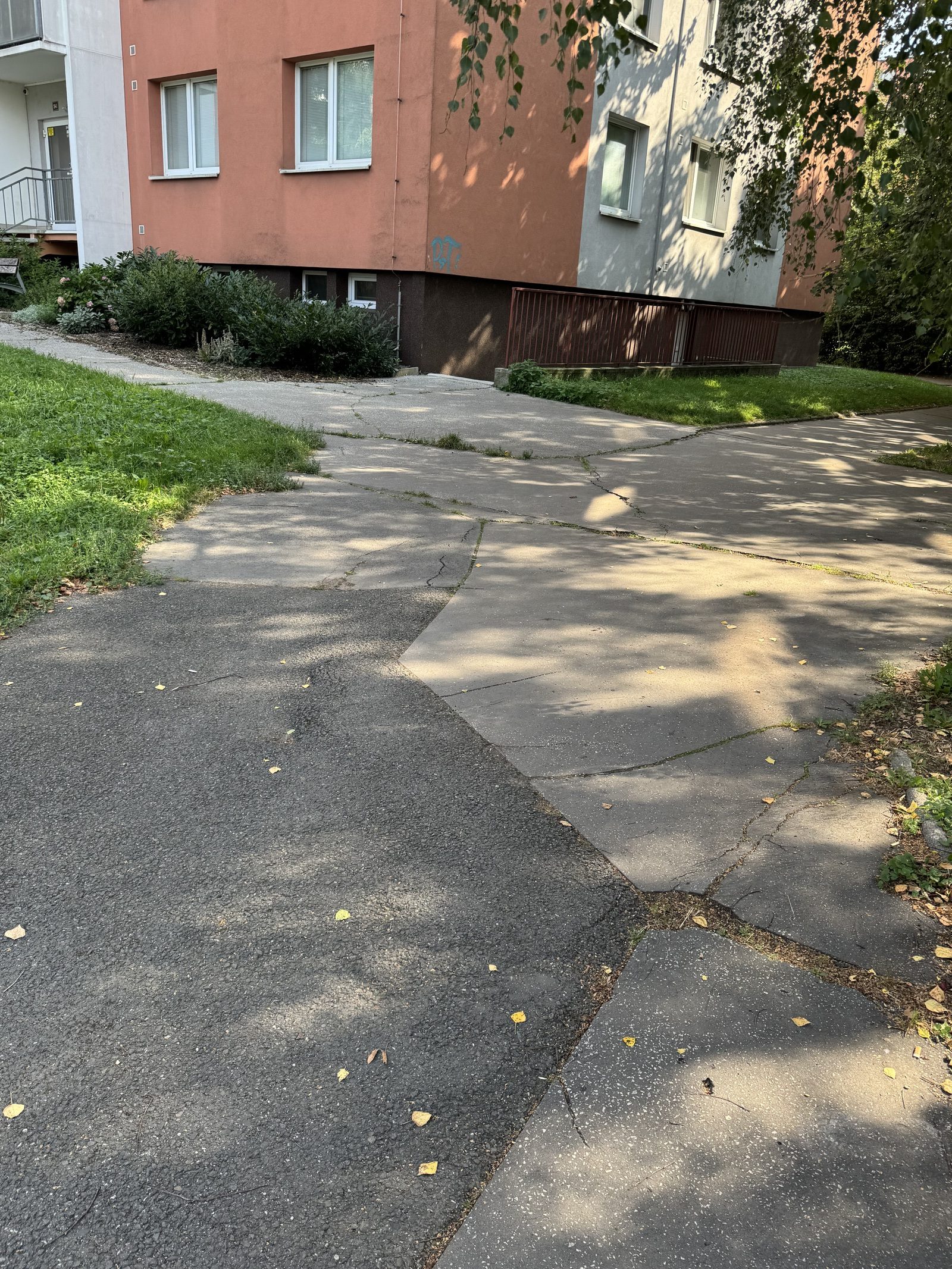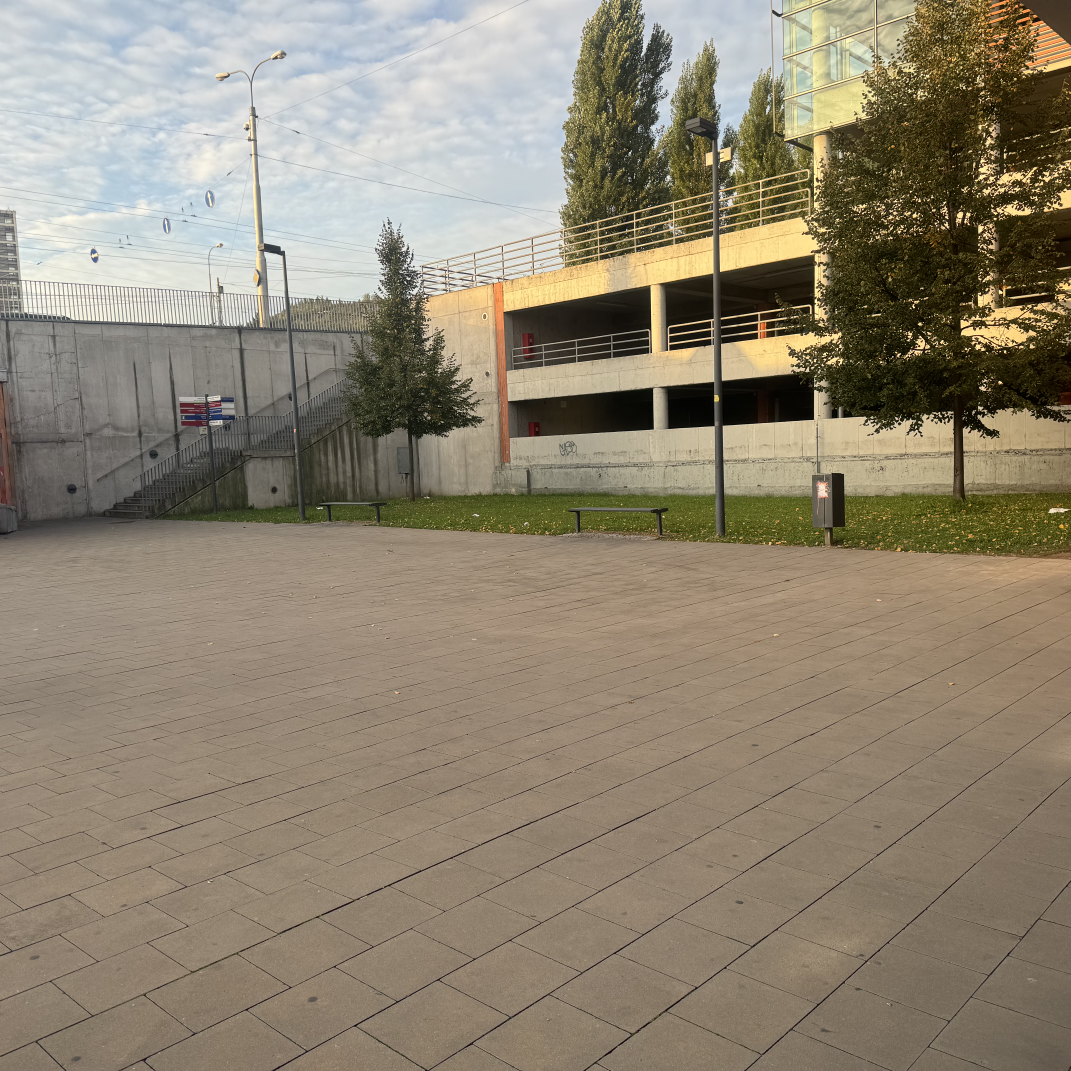 POPIS: V současné době je zmíněný prostor v dezolátním, nevyužitelném stavu. Povrch veřejného prostoru je popraskaný, místy prorostlý trávou a plevelem. Místo je nebezpečné pro jakékoli aktivity – hrozí zakopnutí, pád či jiné úrazy. Ocelová konstrukce podél této betonové plochy vykazuje známky koroze a také představuje bezpečnostní riziko. Prostor působí opuštěně a nevábně. Přilehlé dětské hřiště disponuje pískovištěm a houpací kovovou konstrukcí. Místo je velmi frekventované nejen obyvateli sídliště, ale také klienty zdejších služeb – veterinární ordinace, fyzioterapie pro zvířata, restaurace, autoservis, dětská skupina, mateřská školka, klub pro seniory. Revitalizace veřejného prostoru a hřiště by zajistila bezpečnost pro všechny uživatele – děti, dospívající, dospělé i stárnoucí osoby. Dále by přispěla ke zvýšení kvality veřejného prostoru, který má přímý dopad na komunitní život a psychomotorický vývoj dětí. Vliv má také na integraci a socializaci dětí z různých sociálních skupin a v neposlední řadě na podporu pohybové aktivity a zdravého životního stylu. Zlepšilo by se estetické vnímání prostředí, který nyní působí nevzhledně. Také by se posílily komunitní vazby a mezilidské kontakty. Její nevyužití představuje ztrátu potenciálu místa, které by mohlo sloužit komunitě – dětem, rodičům, stárnoucím lidem i široké veřejnosti. Realizací návrhu by se odstranilo bezpečnostní riziko způsobené stavem betonové plochy. Vytvořil by se živý, otevřený a bezpečný veřejný prostor, který bude odpovídat potřebám moderního městského života. Prostor pro volnočasové aktivity, sport a odpočinek – kombinace funkčních zón pro pohyb a hru, relaxaci i komunitní setkávání.