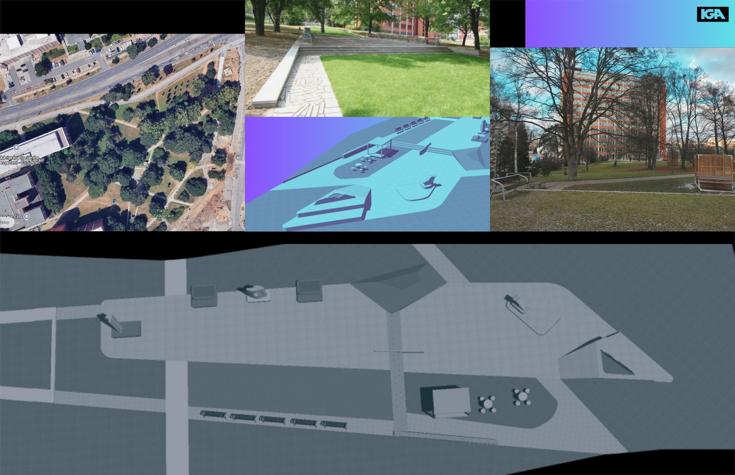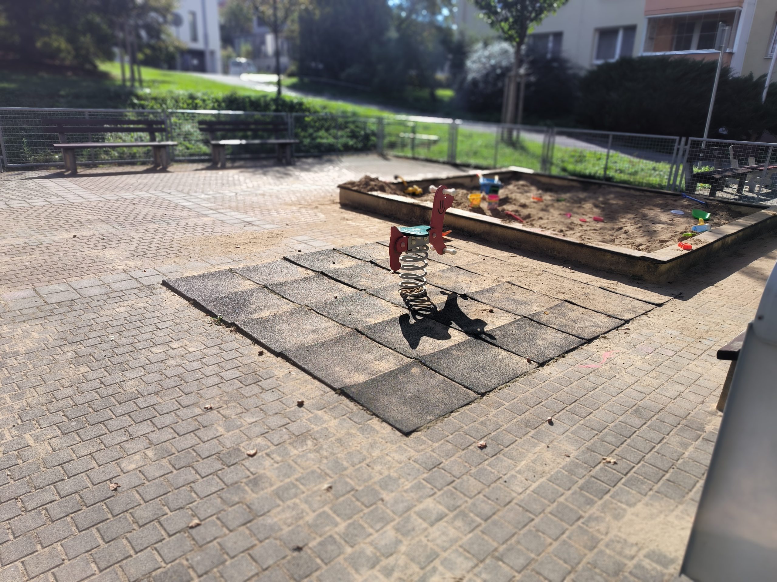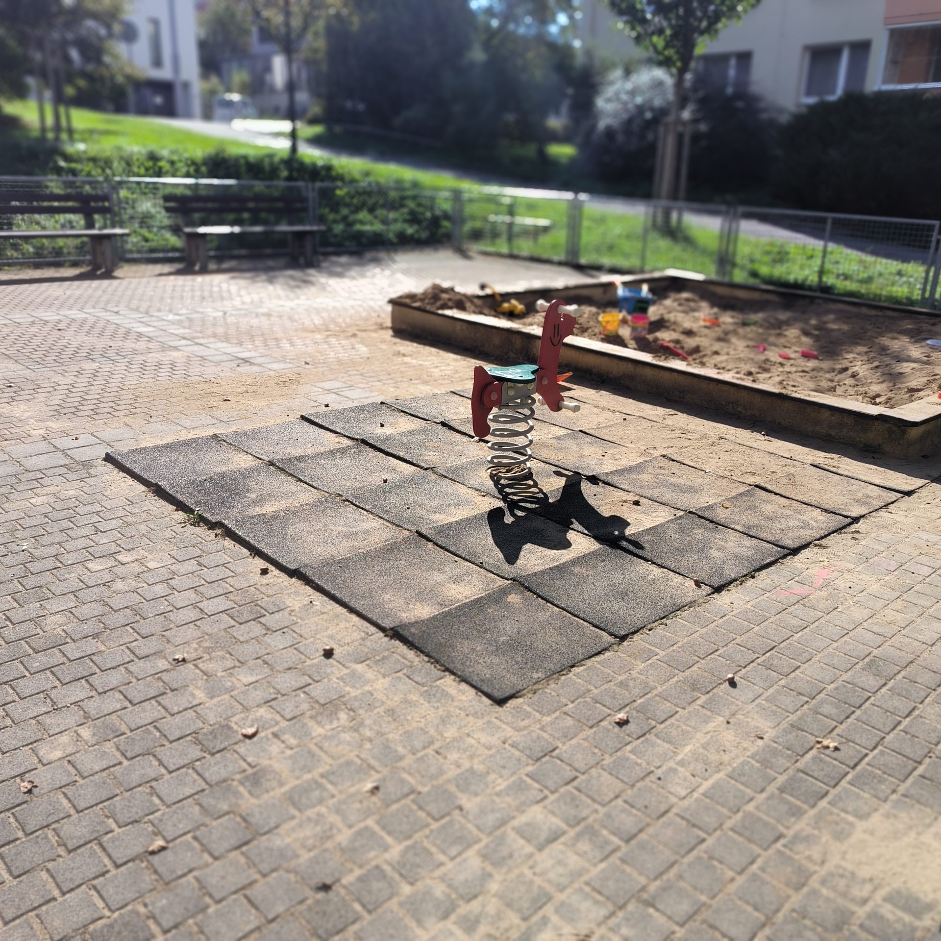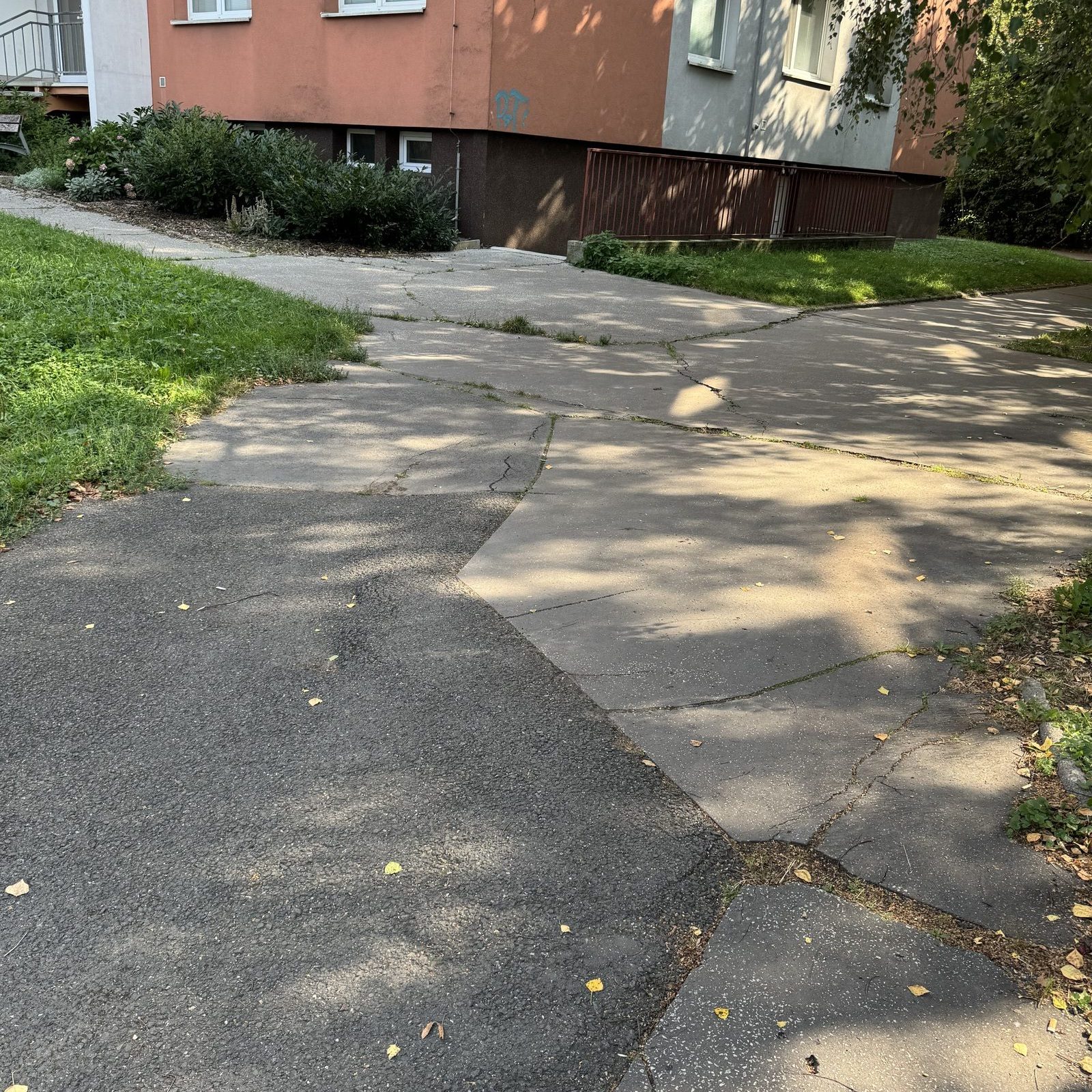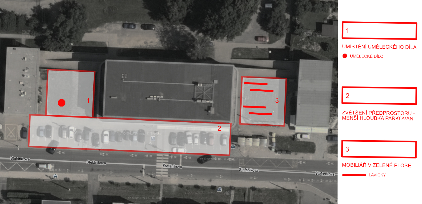 POPIS: V současné době je zmíněný prostor v dezolátním, nevyužitelném stavu. Povrch veřejného prostoru je popraskaný, místy prorostlý trávou a plevelem. Místo je nebezpečné pro jakékoli aktivity – hrozí zakopnutí, pád či jiné úrazy. Ocelová konstrukce podél této betonové plochy vykazuje známky koroze a také představuje bezpečnostní riziko. Prostor působí opuštěně a nevábně. Přilehlé dětské hřiště disponuje pískovištěm a houpací kovovou konstrukcí. Místo je velmi frekventované nejen obyvateli sídliště, ale také klienty zdejších služeb – veterinární ordinace, fyzioterapie pro zvířata, restaurace, autoservis, dětská skupina, mateřská školka, klub pro seniory. Revitalizace veřejného prostoru a hřiště by zajistila bezpečnost pro všechny uživatele – děti, dospívající, dospělé i stárnoucí osoby. Dále by přispěla ke zvýšení kvality veřejného prostoru, který má přímý dopad na komunitní život a psychomotorický vývoj dětí. Vliv má také na integraci a socializaci dětí z různých sociálních skupin a v neposlední řadě na podporu pohybové aktivity a zdravého životního stylu. Zlepšilo by se estetické vnímání prostředí, který nyní působí nevzhledně. Také by se posílily komunitní vazby a mezilidské kontakty. Její nevyužití představuje ztrátu potenciálu místa, které by mohlo sloužit komunitě – dětem, rodičům, stárnoucím lidem i široké veřejnosti. Realizací návrhu by se odstranilo bezpečnostní riziko způsobené stavem betonové plochy. Vytvořil by se živý, otevřený a bezpečný veřejný prostor, který bude odpovídat potřebám moderního městského života. Prostor pro volnočasové aktivity, sport a odpočinek – kombinace funkčních zón pro pohyb a hru, relaxaci i komunitní setkávání.